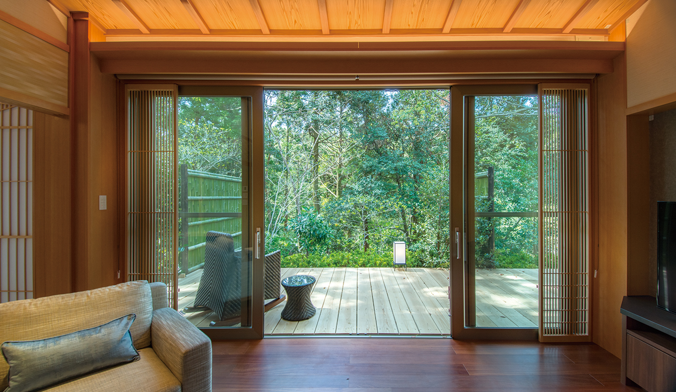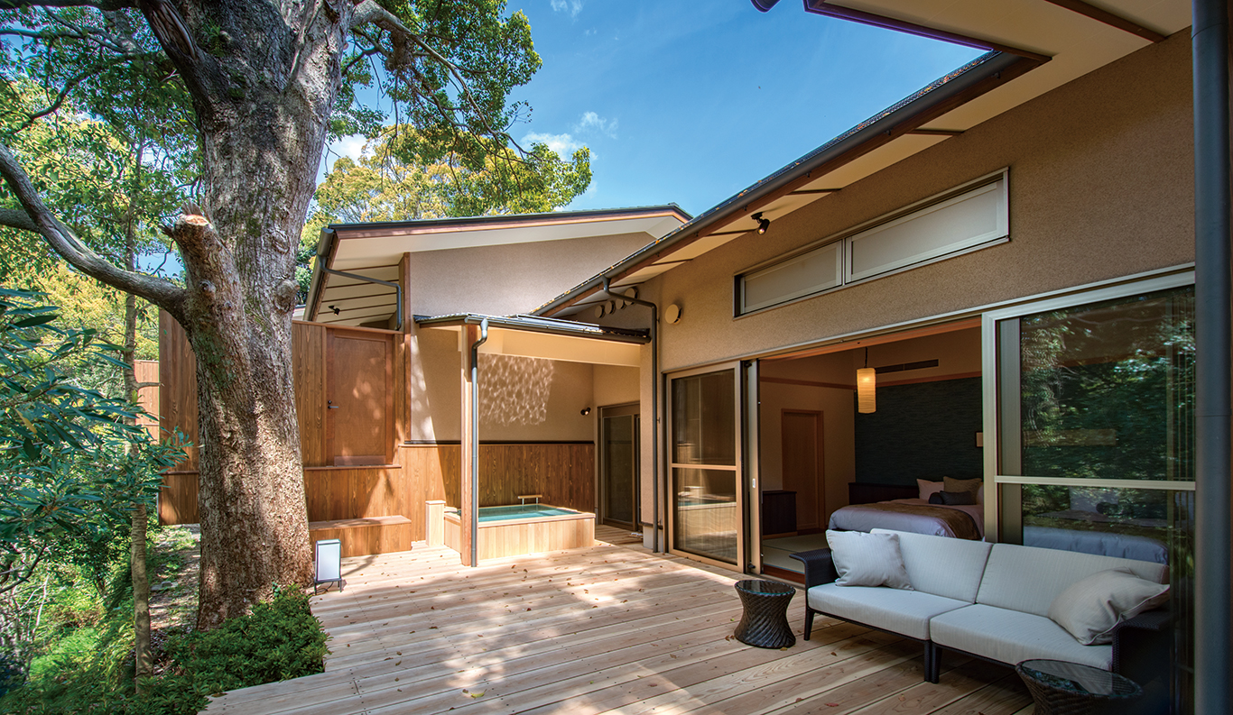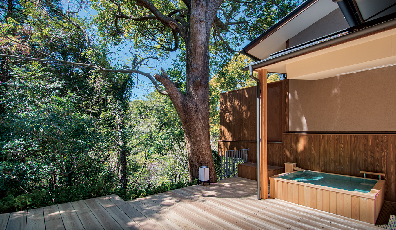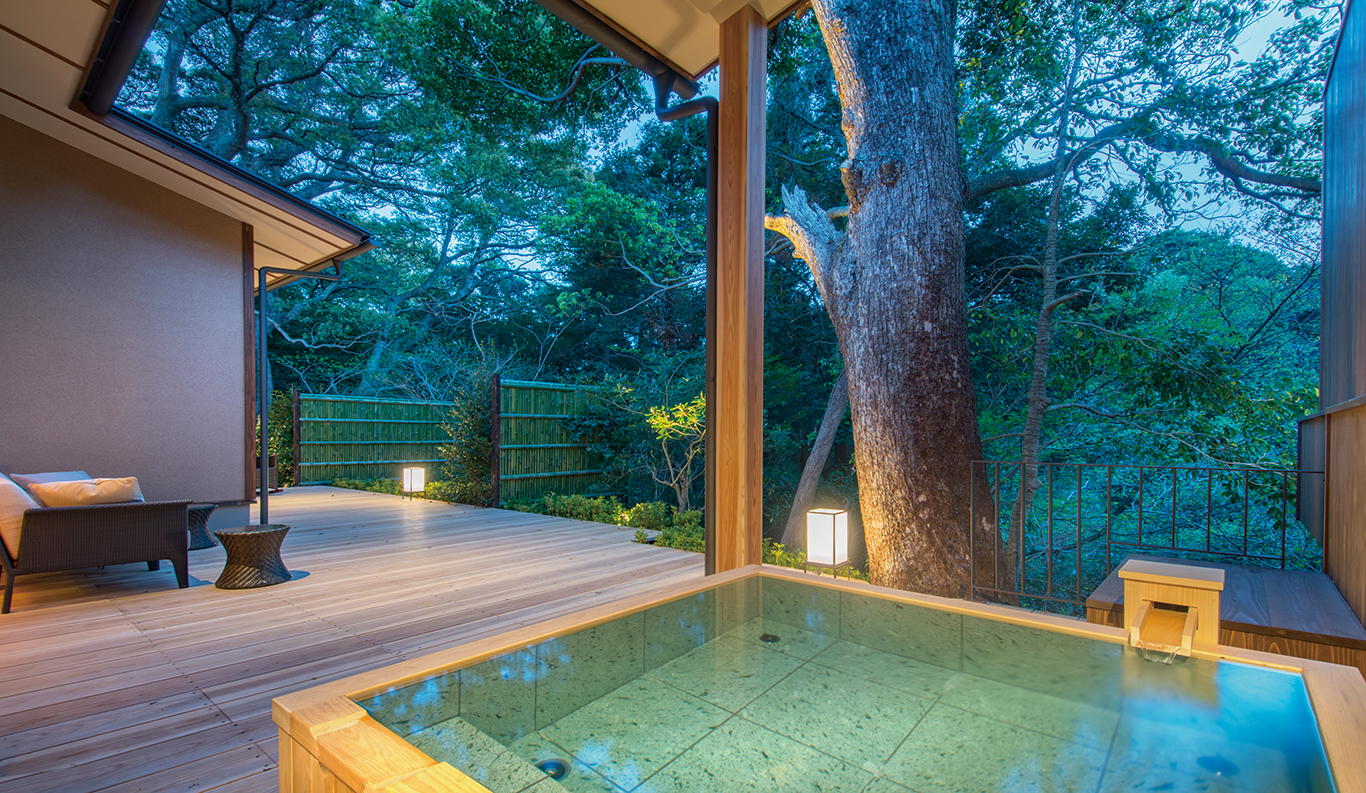 In addition to a bedroom and living area, the roomy villa has a traditional tatami room, complete with tokonoma alcove decorated with a hanging calligraphy scroll and washi paper lamps. With low hassock chairs, it’s a comfortable lounge space but also perfect for a little morning meditation or yoga. Outside, a wood deck stretches the length of the building, surrounded by the shiny green leaves of camellia bushes and shaded by an ancient camphor tree whose arms stretch over the villa in silent benediction. An outdoor hot spring bath made of hinoki cypress and green-tinged Izu stone also shelters under its boughs, a perfect spot to watch the forest’s songbirds as they chase each other from branch to branch.