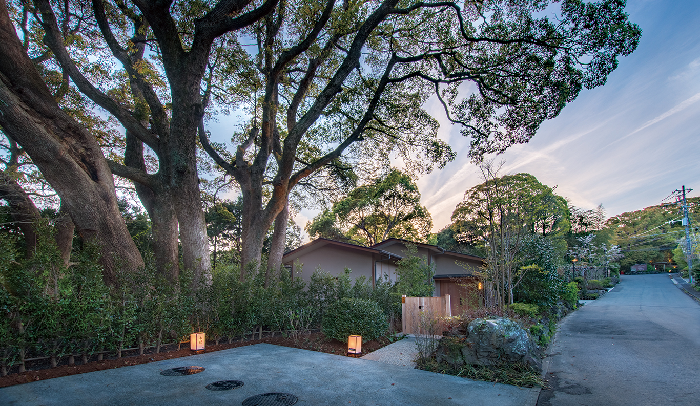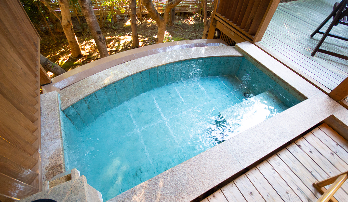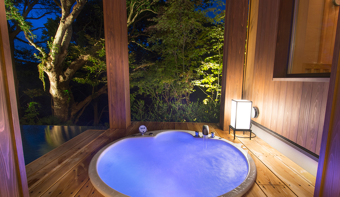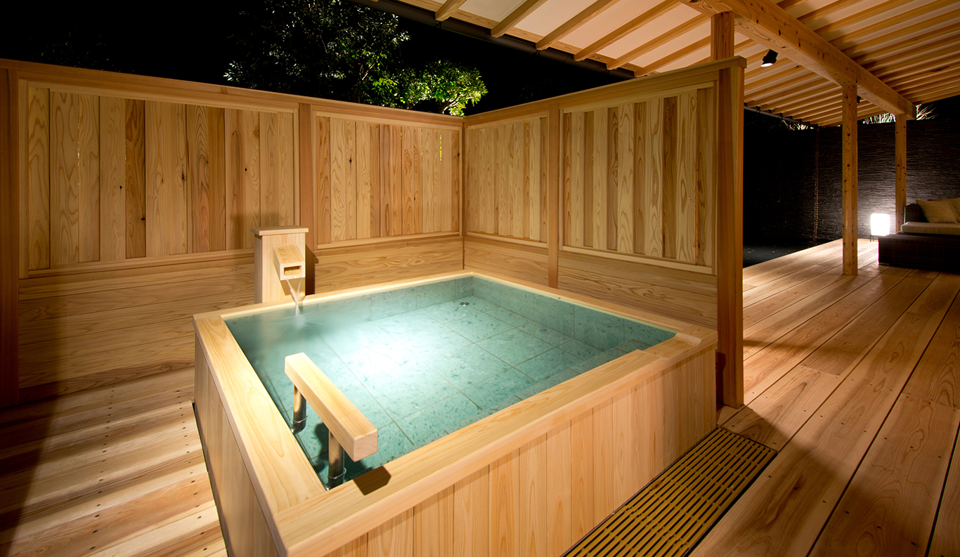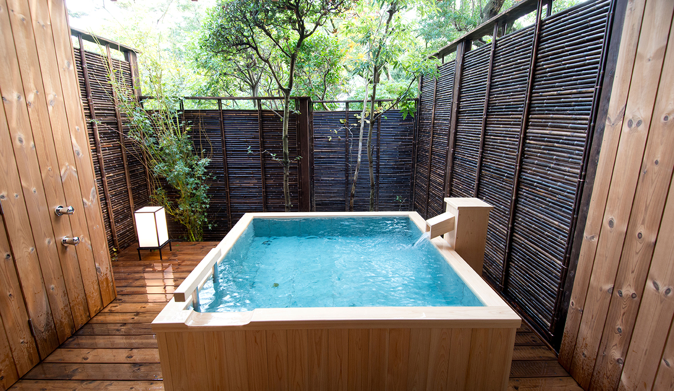 In addition to a bedroom and living area, the roomy villa has a traditional tatami room, complete with tokonoma alcove decorated with a hanging calligraphy scroll and washi paper lamps. With low hassock chairs, it’s a comfortable lounge space but also perfect for a little morning meditation or yoga. Outside, a wood deck stretches the length of the building, surrounded by the shiny green leaves of camellia bushes and shaded by an ancient camphor tree whose arms stretch over the villa in silent benediction. An outdoor hot spring bath made of hinoki cypress and green-tinged Izu stone also shelters under its boughs, a perfect spot to watch the forest’s songbirds as they chase each other from branch to branch.